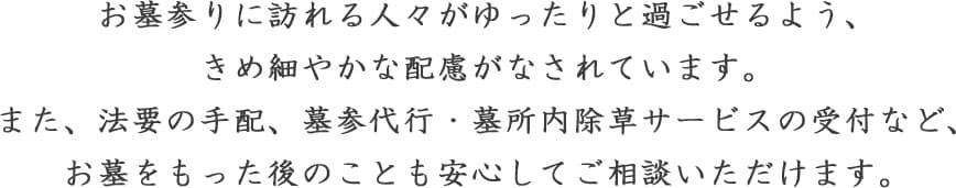 墓所内除草や、献花・墓参代行、植栽の手入れなどの各種代行サービスが豊富です。※有料