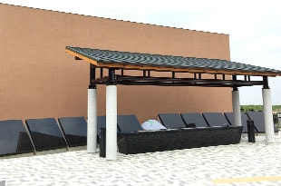 中央に4本の木が植えられ、周囲を植栽で彩られています。