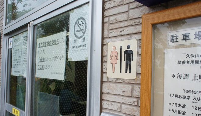 管理事務所はトイレも貸していただけ、水場も近くにあり、裏手はゴミ捨て場になっているので、安心してお墓参りができます。