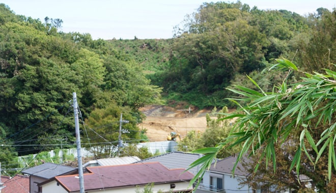 墓地建設の形跡があまり見当たらない「舞岡しぜん墓園」。実際どこまで工事が進んでいるのか、気になるところです。現状、見渡す限り緑鮮やかな山々が広がっています。