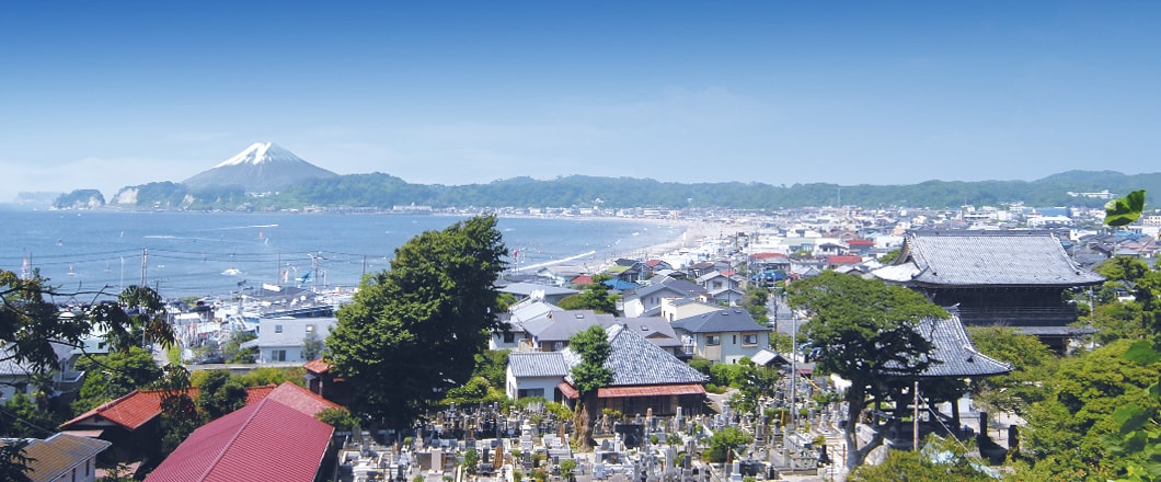 鎌倉材木座海岸前にあり、総門からは海越しに富士山がくっきりと見える、風光明媚な立地にあります。