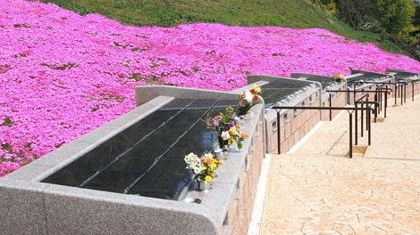 色鮮やかな芝桜が美しい永代供養墓「桜寿(おうじゅ)」。ご利用人数によって区画をお選びいただけます。